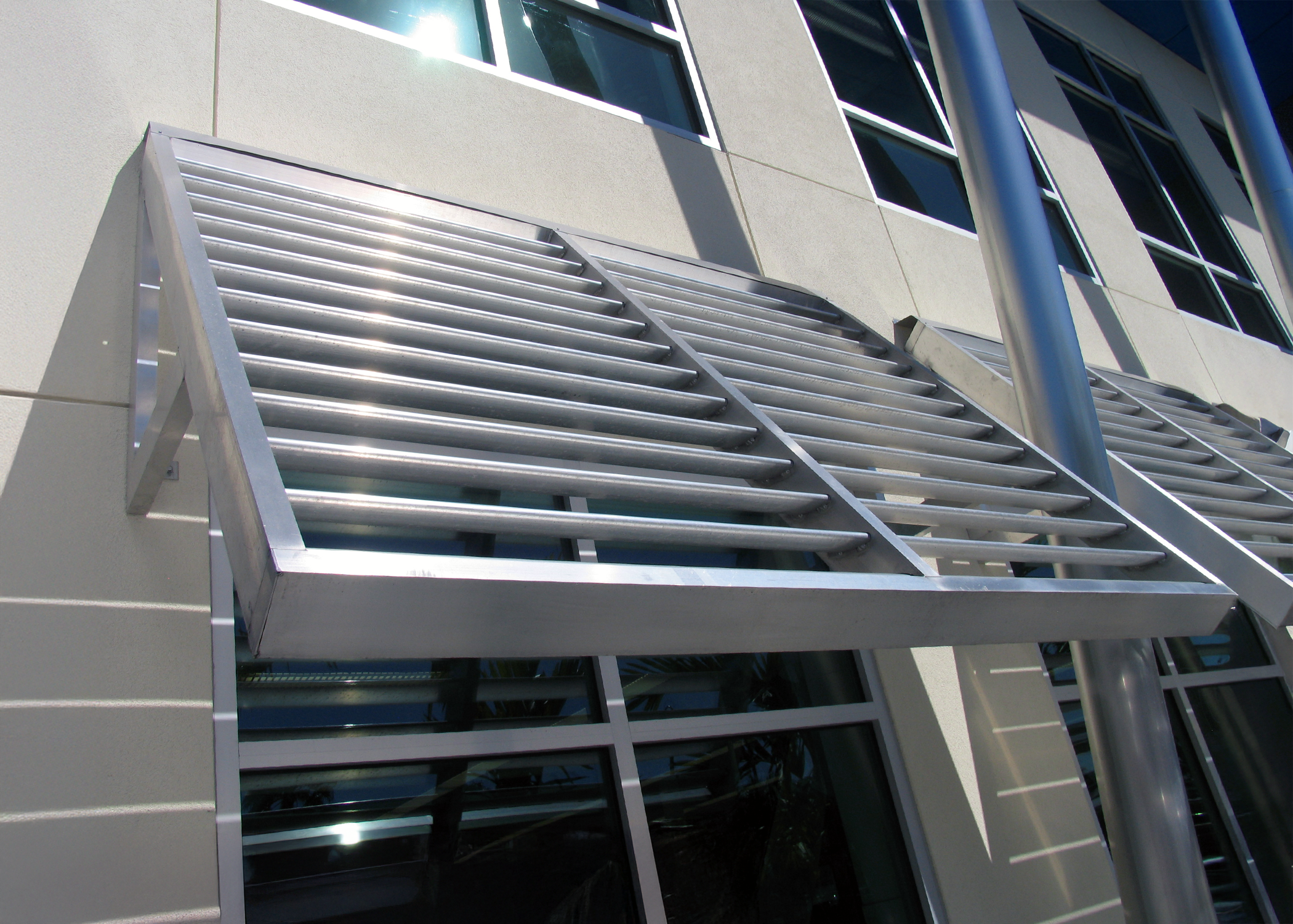The Roof Deck Awning is a pre-engineered awning constructed from a 1” aluminum welded tube frame with sloped corrugated or standing seam infill.