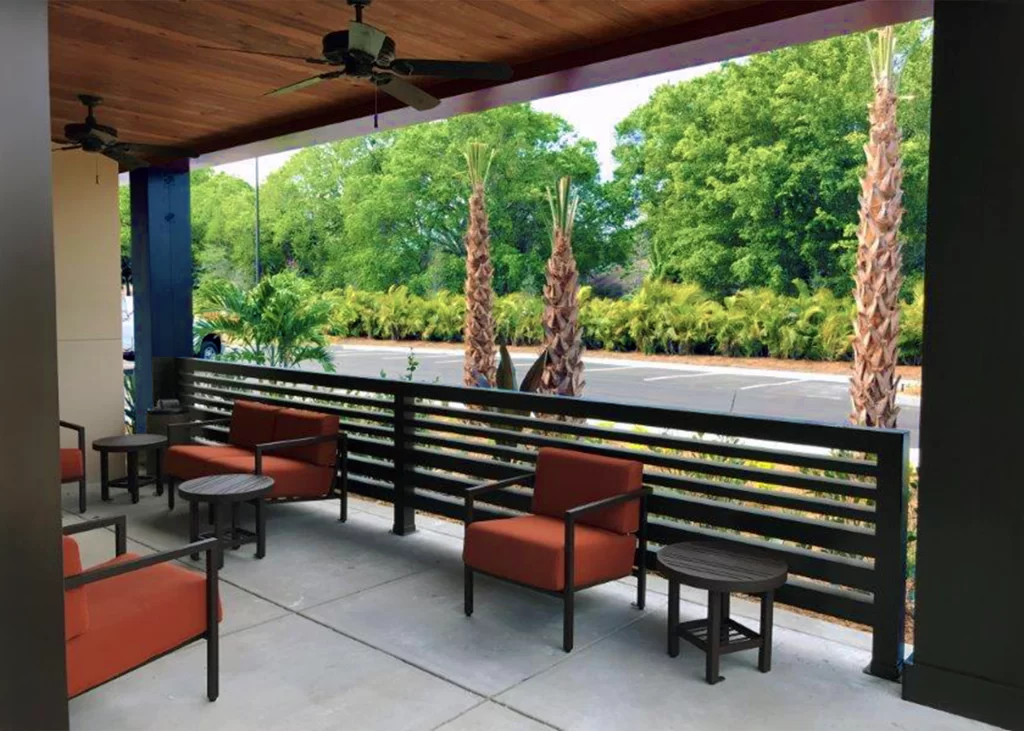 FenWall’s Welded Patio Railing provides a contemporary and “cozy” atmosphere to any commercial patio while providing the necessary divide between your customers and the parking lot or street. This rail is available in your specified powder coat color for recognizable and consistent branding for one or many locations.
